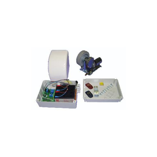 Armoire électronique avec transformateur intégré, récepteur radio 433 MHz, et télécommandes à 4 fonctions.