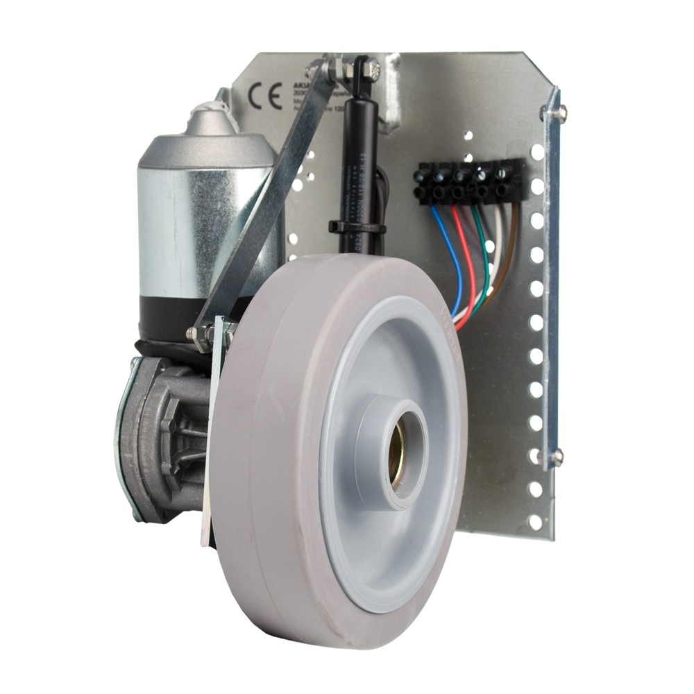 Motoréducteur 24 V avec châssis thermo-zingué et roue en gomme pour une excellente adhérence, même sur sols glissants.