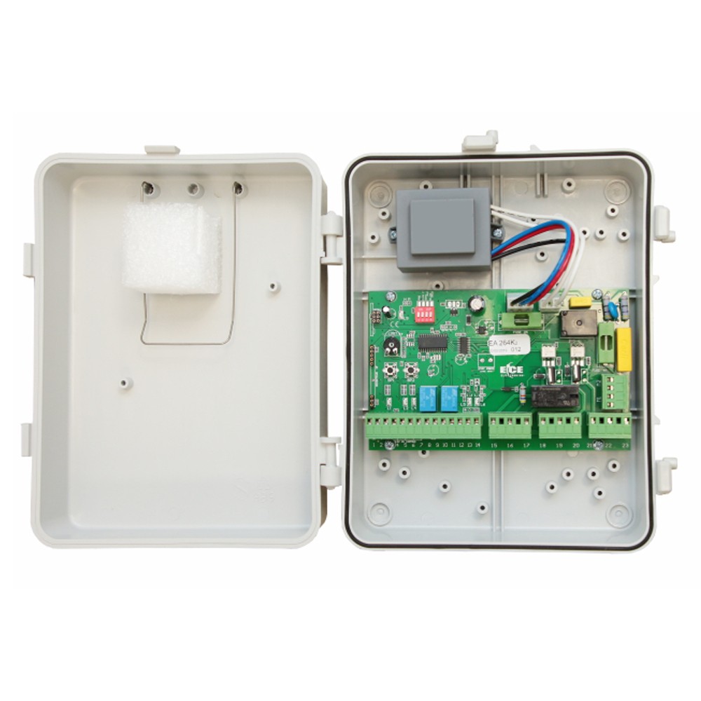 Armoire de commande EA263 avec ouverture totale ou piétonne, ralentissement automatique, fermeture semi-auto ou auto, et réglage de la puissance moteur.