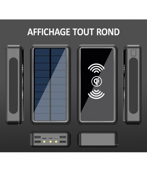 Batterie externe solaire Sans fil Induction de 80 000 mAh, idéale pour l’extérieur. Étanche, antichoc, avec charge rapide, 4 ports USB, fonction sans fil QI, lampe LED SOS et boussole intégrée, elle recharge jusqu’à 3 appareils simultanément pour une autonomie maximale en toutes circonstances.