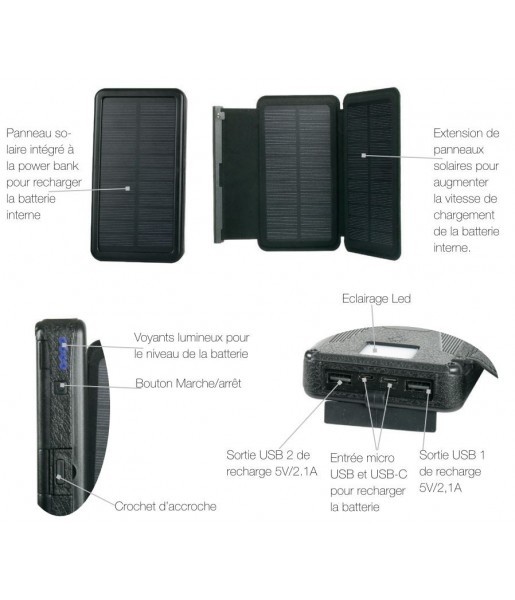 Dotée de panneaux solaires pliables et amovibles, cette batterie externe solaire est spécialement conçue pour les aventuriers et les utilisateurs nomades. Compacte, robuste et pratique, elle garantit une recharge même loin d’une prise électrique, ce qui en fait un atout majeur pour vos activités en extérieur.