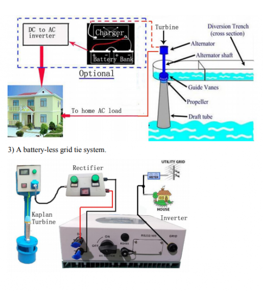 Le principe de cette turbine à hélice fut découvert au 19ème siècle puis amélioré par Kaplan en 1910 et utilisé pour les grosses turbines en réalisant des hélices à pas variable (très largement répandues à travers le monde). Cette micro turbine utilise le même principe de base, la photo ci-dessous illustre le fonctionnement d’une installation.