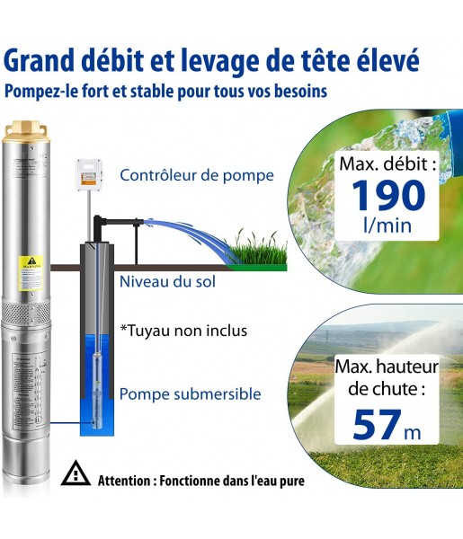 Pompe Immergée pour Puits 190 L /min 57 m Pompe à Eau pour Puits Profond en Acier Inox, Électrique 1100 W Submersible Automatiqu