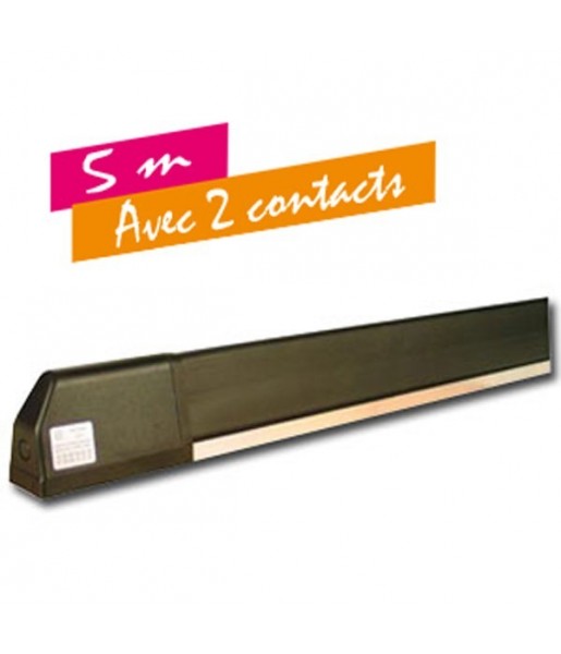 Tranche de sécurité homologuée, prémontée et redécoupable avec 2 contacts - 5 mètres Tranche de sécurité homologuée à contact, prémontée, redécoupable, longueur 5 mètres. La tranche de sécurité mécanique offre de nombreux avantages : - Sensibilité : réaction rapide pour une meilleure sécurité; - Usure faible : fonctionnement précis même en cas de détérioration du bourrelet; - Fonctionnement : sans alimentation et sans carte électronique annexe. Les tranches de sécurité sont obligatoires si la force du vantail est supérieure à 15 daN (15 kg). Dans le cas où le portail et la clôture ont des barreaux, il est conseillé de mettre un grillage fin sur la clôture sur tout le trajet du portail. Sinon, il faut prévoir une tranche de sécurité à chaque zone de cisaillement (Zc). Si plusieurs tranches de sécurité sont nécessaires, raccorder les contacts de celles-ci obligatoirement en série sur la centrale de commande.