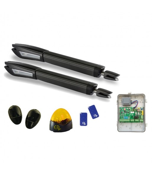 Inclus : 2 vérins BJ400, 2 télécommandes 4 fonctions, 1 feu clignotant, cellules de sécurité, armoire de commande